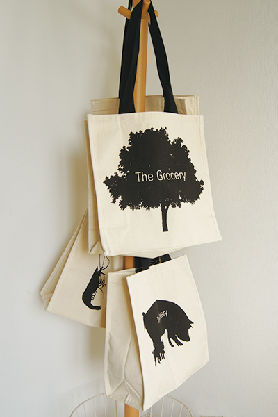 オーガニック食品を取り揃える食料品店らしい、5種類のオリジナルデザインが魅力のコットン製バッグ。 木・リンゴ・魚のホネ・エビ・ブタの親子・・・モノトーンのシックな色使いの中にも温かみが感じられるデザインは、目的や気分にあわせて選べるのが楽しい!持ち手が長めなのも何ともイギリスらしいマーケットバッグです。